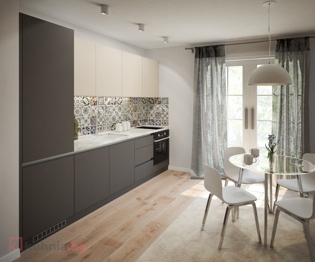 Малка кухня, в която намираме място за вграден хладилник и фурна. Изчистените графитени и ванилови тонове са комбинирани с акцентни цветни плочки.