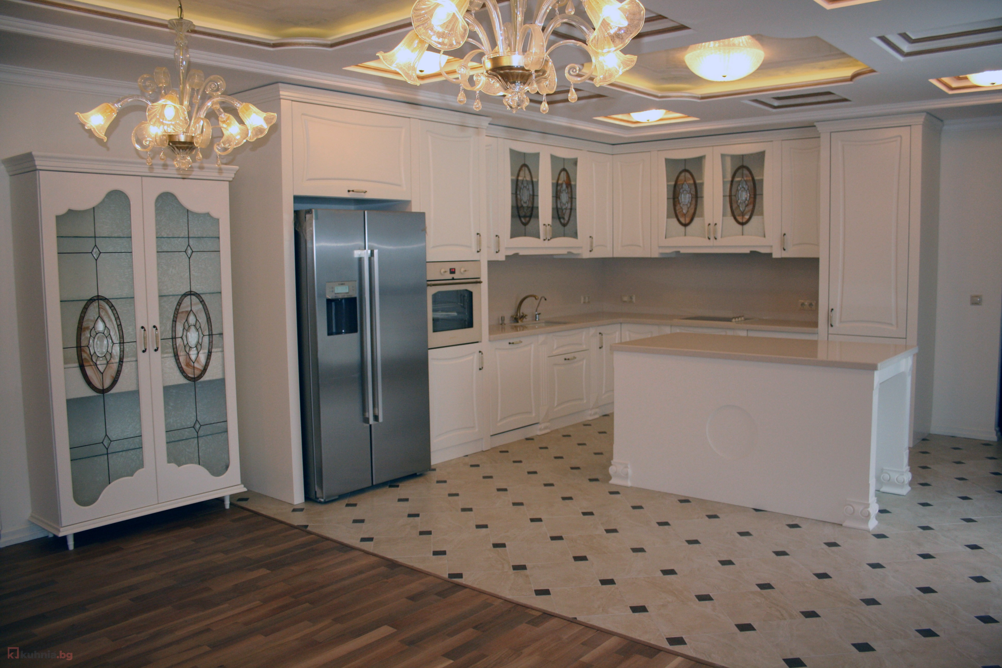 Клиентите ни се довериха напълно за дизайна и изработката на тази кухня. Тя е част от най-високия ни клас класически кухни, като е изработена от дъб, който е завършен с байц в цвят слонова кост и ръчно е нанесена цветна патина. Изработката на дърворезбата поверихме на дърворезбар,който разработи повечето елементи специално за този проект.