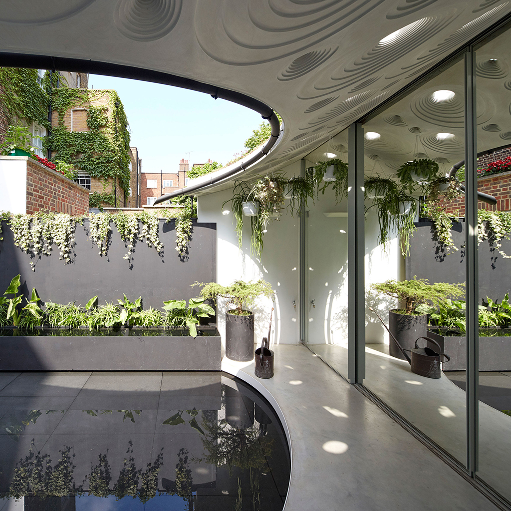 Къщата се отличава с извити нови удължения, с вдлъбнат, покрит с растения покрив и плитък басейн с вода по средата.