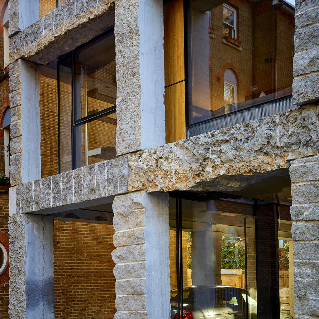 Номиниран в една от категориите на Dezeen Awards, този 7-етажен блок се характеризира със структурен екзоскелет от от необработен камък.