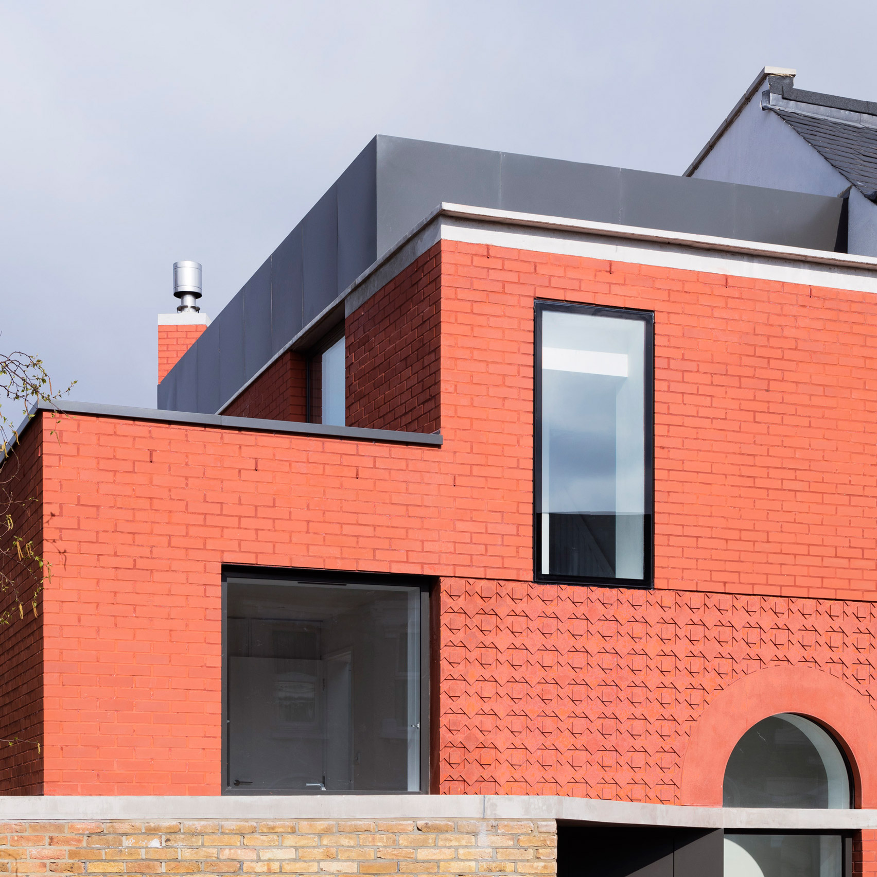 Това ново допълнение към терасата на къща в Източен Дулуич се откроява от всички останали, благодарение на дръзка фасада от червени тухли и скулптирани плочки.