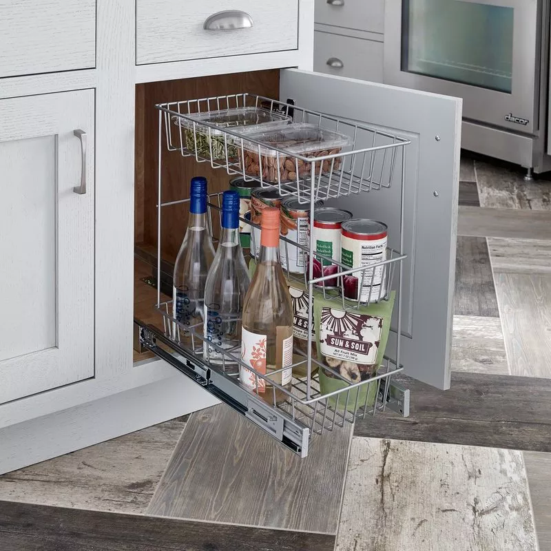 Друг интересен начин за освобождаване на повече място в малката си кухня е да създадете „под-рафтове“ с кошници под тях или организатори за нареждащи се един под друг шкафове.