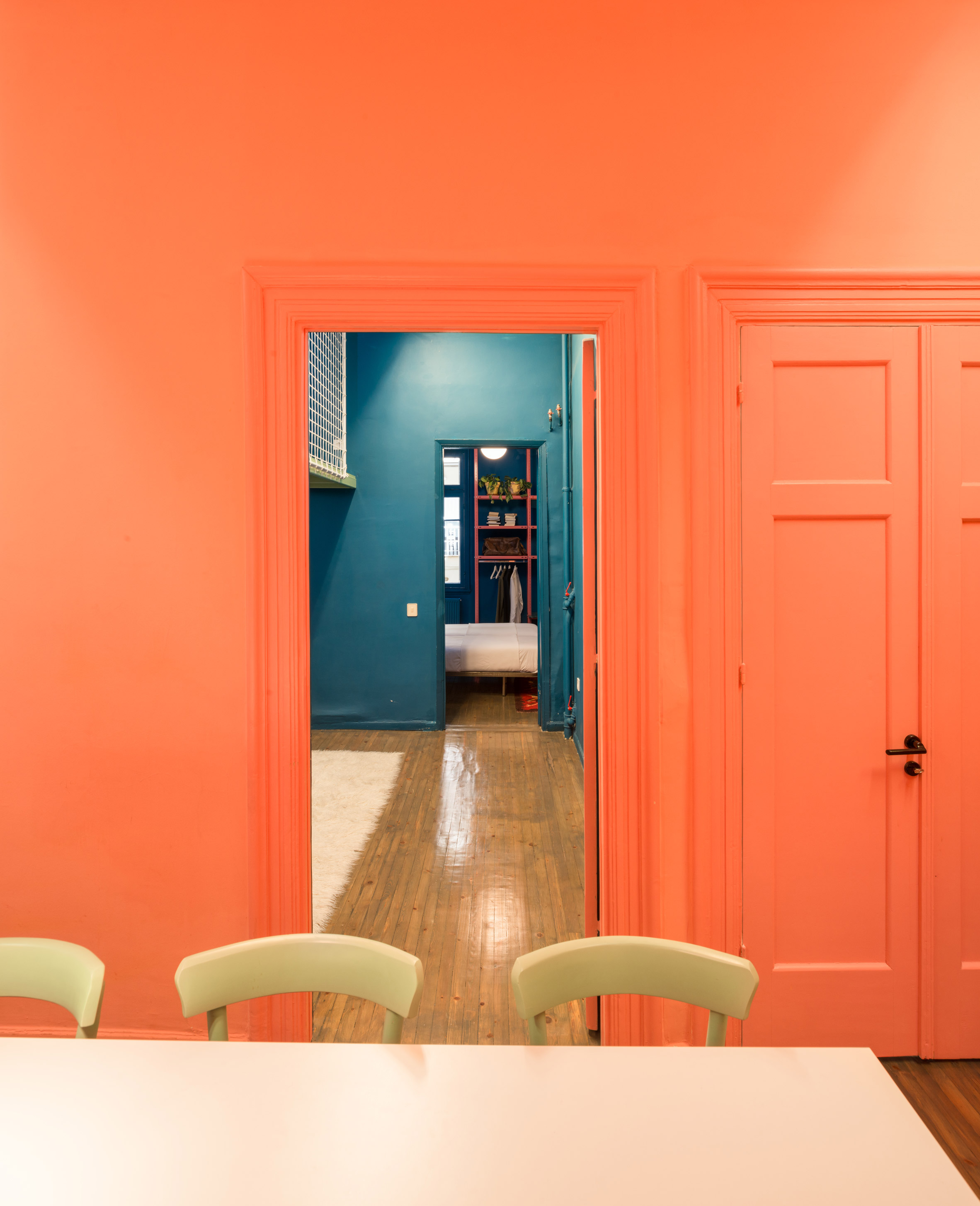 Джианикис избира 3 смели цвята, с които да организира пространството. Коралово розовото е използвано за пространства, които гледат към морето, лазурно синьото е използвано в такива, които гледат към квартала, а пастелно зеленият оттенък е използван в мокрите помещения на апартамента като кухнята, банята и тоалетната.