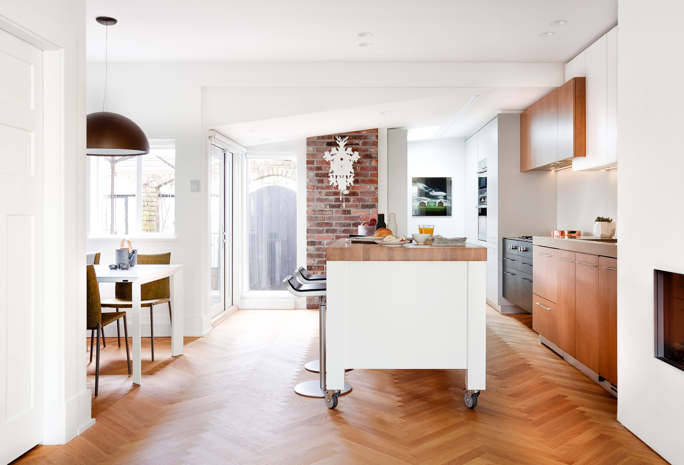 Кухненските шкафове и плотове са съвременни и съчетават историческите детайли на къщата. Използването на бели и дървени повърхности допринася за обвързването на двата типа интериор.