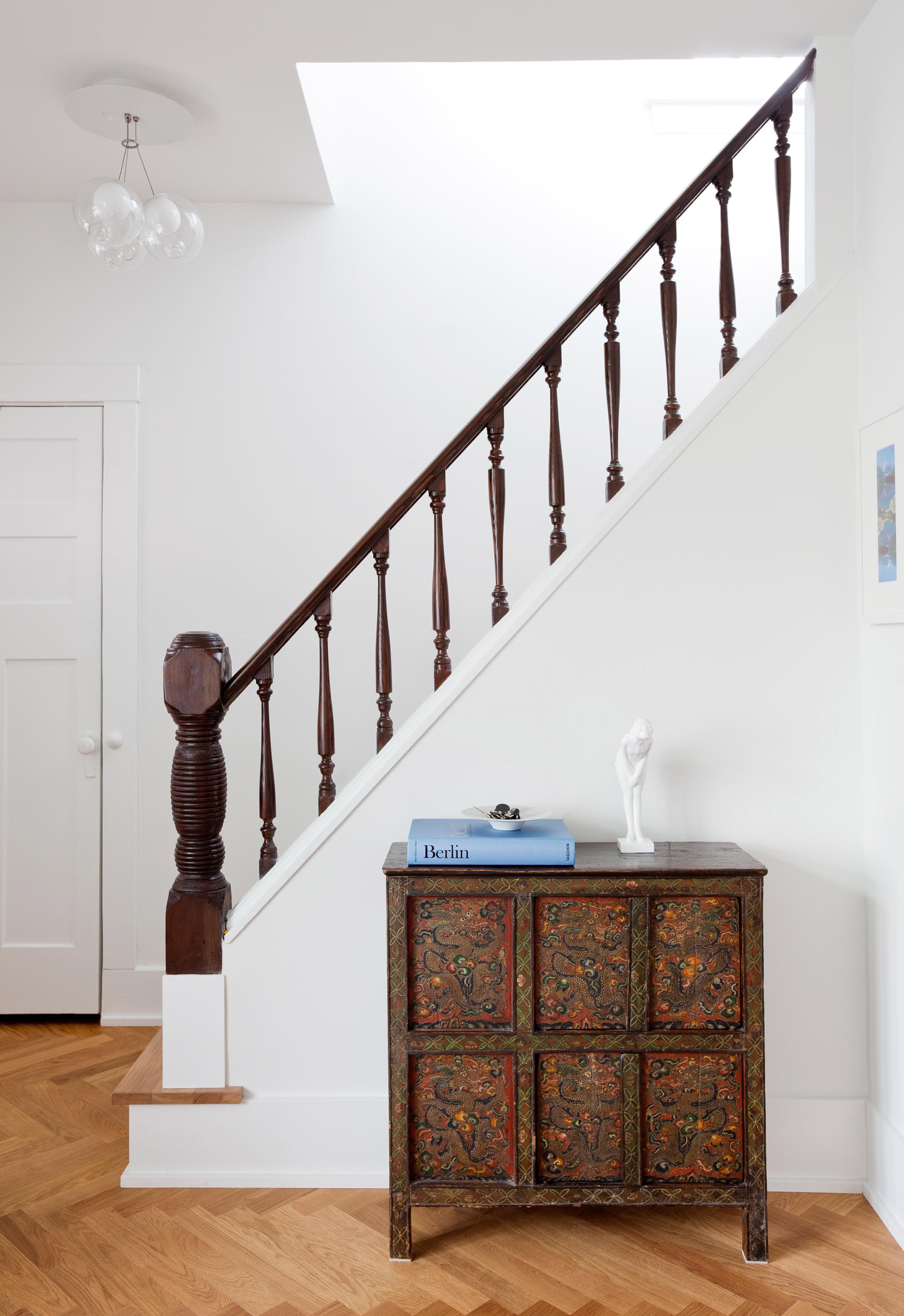 Запазените детайли в дома включват лъскавата дъбова подова настилка, експонирана червена тухлена стена, врати с кристални дръжки, както и изрисуван парапет от тъмно дърво на стълбището.