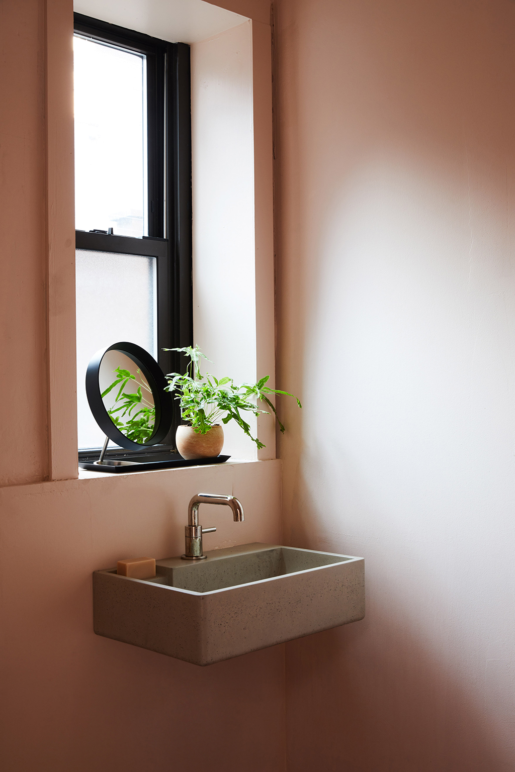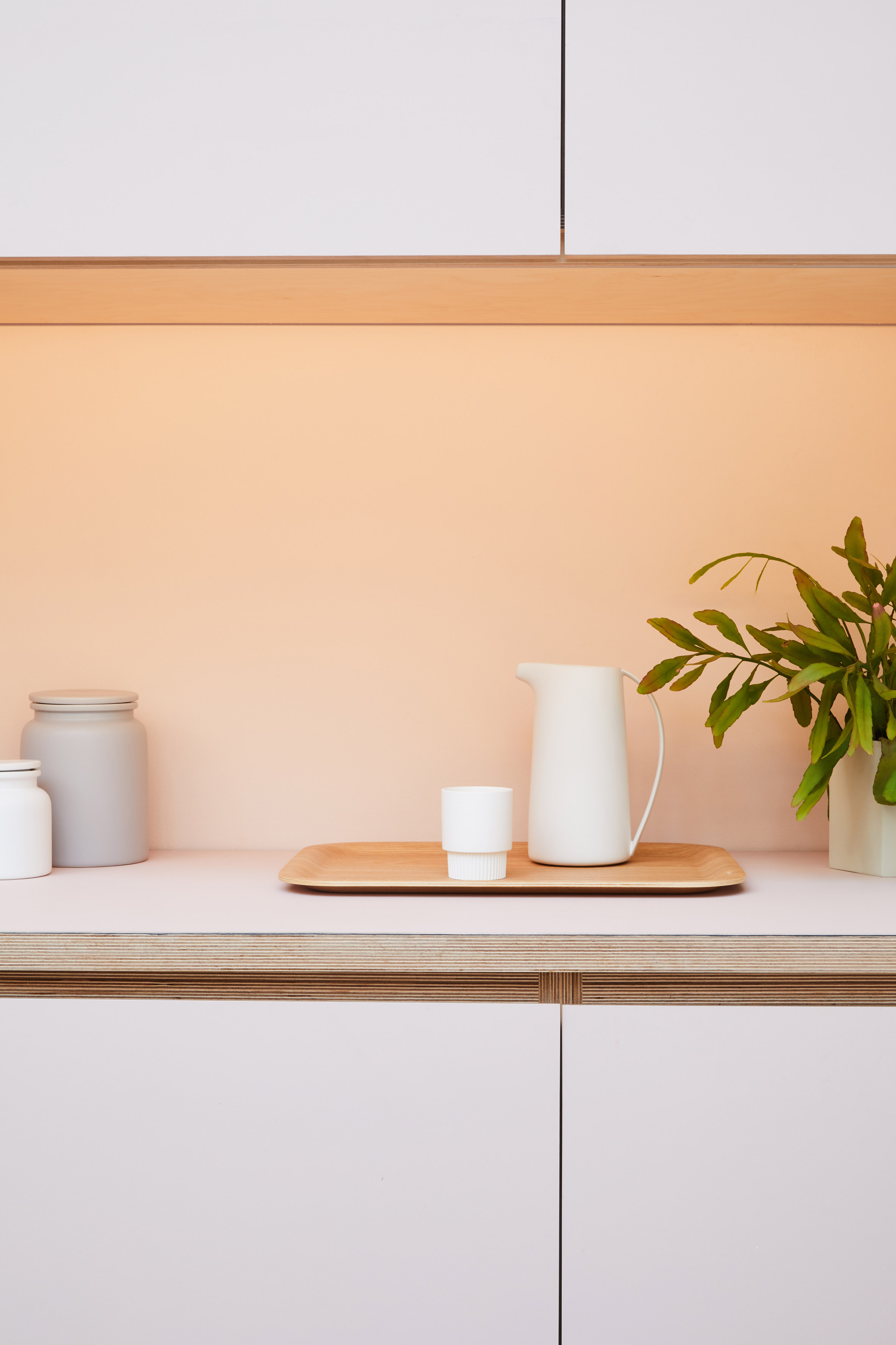 Кухнята се отличава с бели стени, светлосиви подове и шкафове от линолеум, оцветен в меко розово - нюанс, който е известен като "розово на 90-те" заради неотдавнашното му разпространение.