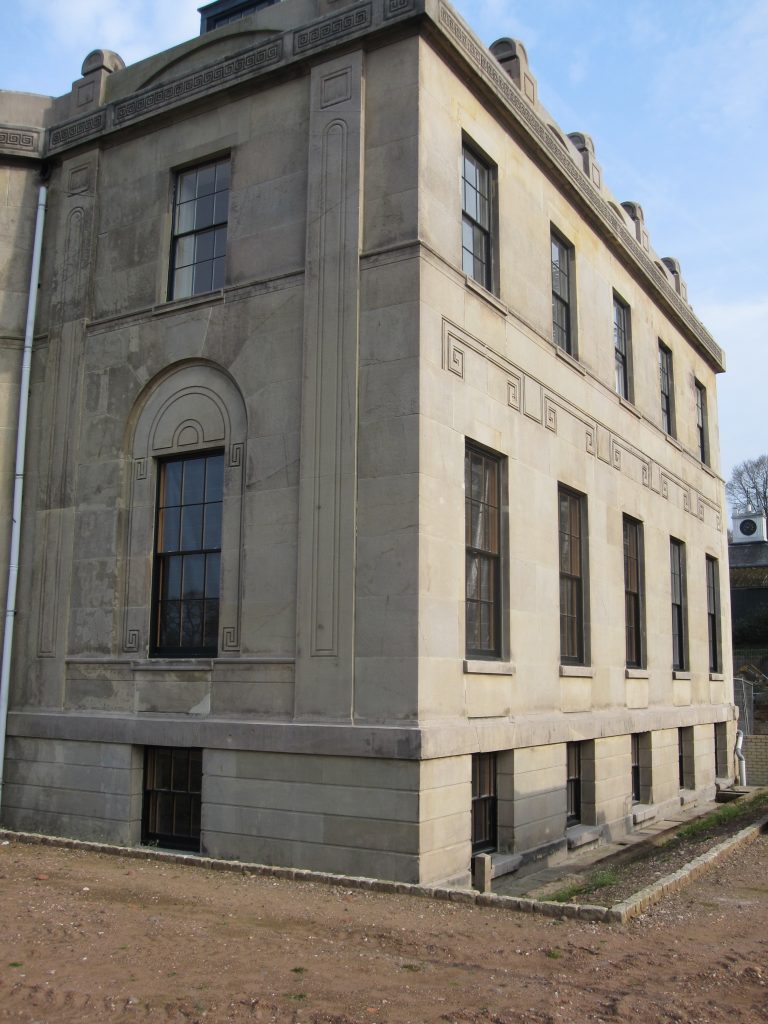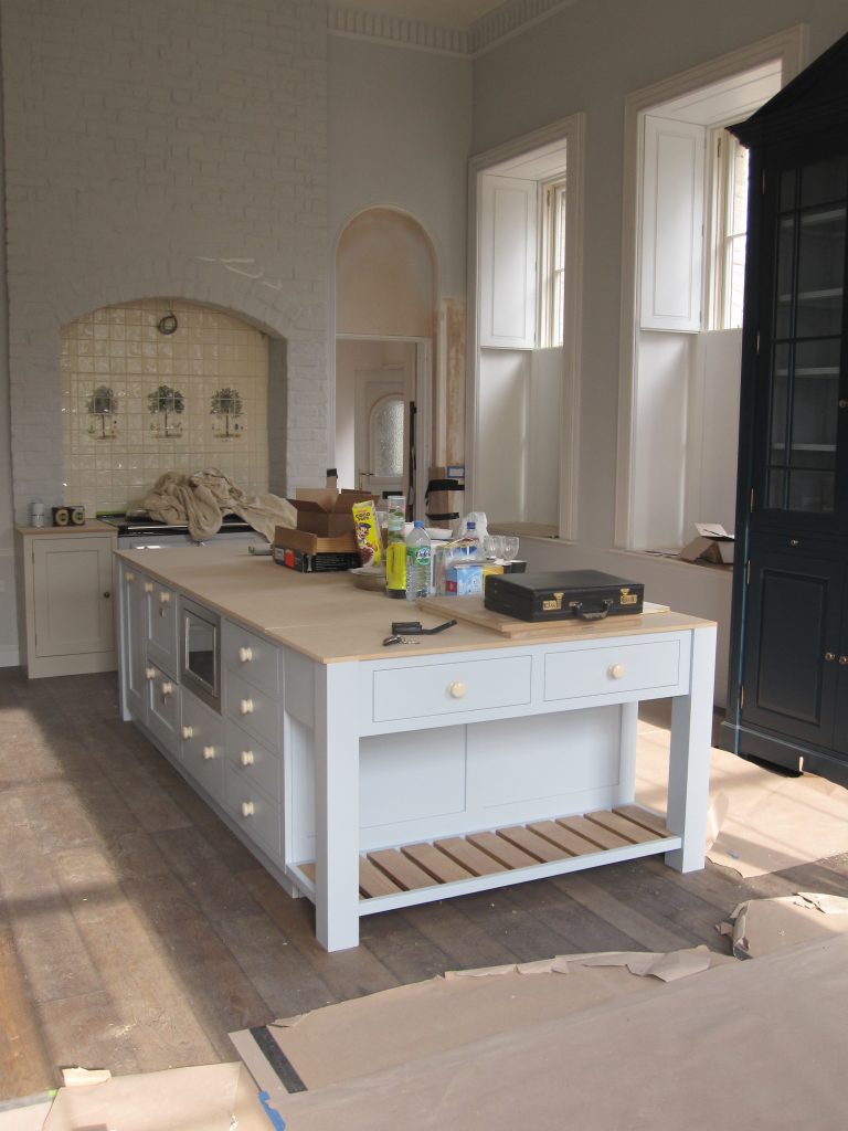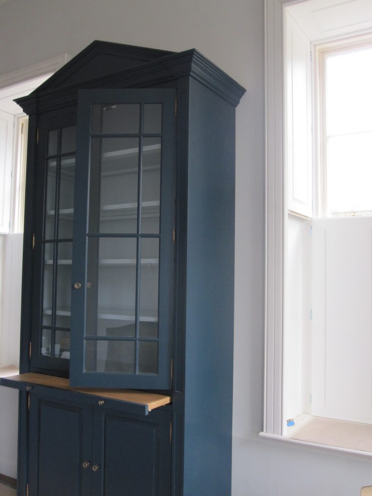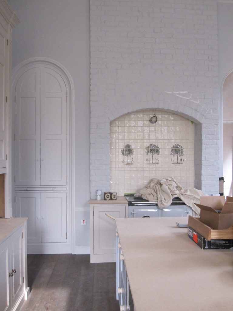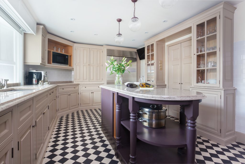 Кристофър е взел детайлите от арката на прозорците на сградата и ги е използвал при създаването на шкафовете в кухнята. Оцветеният в тъмно синьо полиран кабинет има леко набраздена повърхност, което е познат елемент на обзавеждането от този период. Използвани са високи шкафовете над мивката, и има гръцки ключов дизайн, който отново е взет от детайл от екстериора на зданието.