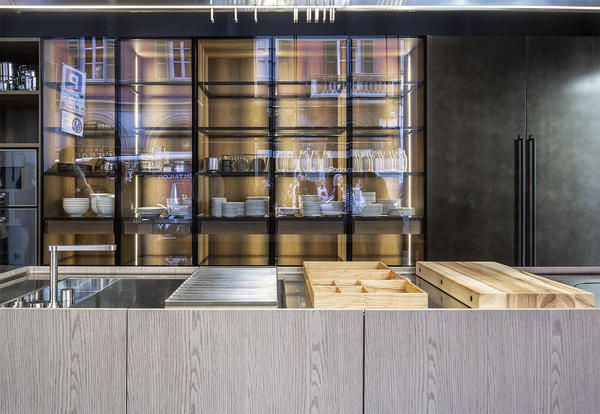 Във вътрешността на тези 450 кв. м. 6 различни модели кухни са сложени за разглеждане до последния детайл, показвайки изключителността на проектите на Arclinea. Ако преди 30 години марката представи Italia в стомана, типична за работната зона на професионалните кухни, сега изследванията им за модерни решения доведоха до създаването на Convivium. Заедно с Closet системата, пространствата са затворени с прибиращи се врати, за да се изолират зоните, предназначени за обслужване.