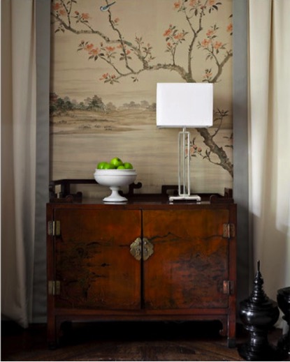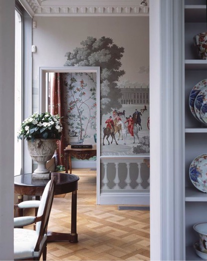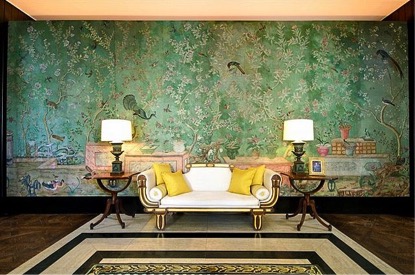 Рисувана от De Gournay стена с имитация на китайски мотиви на фона на проста симетрия