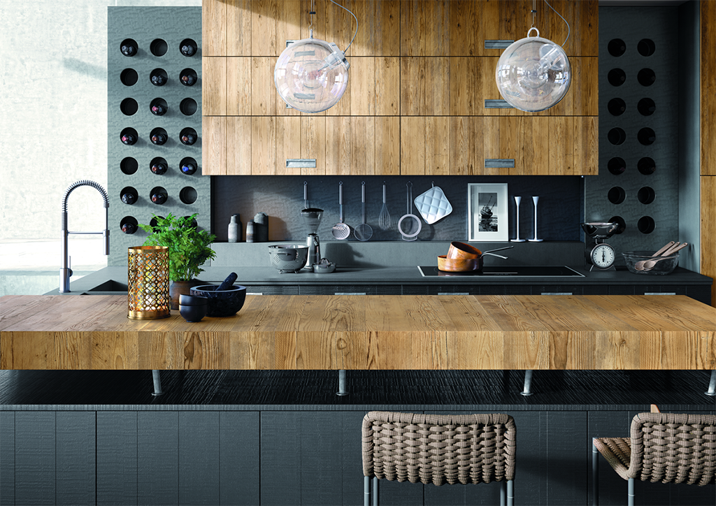 В модерните кухни се комбинират стъкло, камък, редки мрамори, дървесина, метали, керамика, ламинат и бетон. Смесването на материали дава енергия на пространството. Доминиращи са тъмните промити земни тонове и матовите, леко релефни повърхности. Натуралният мрамор и неговите имитации продължават да са актуални.