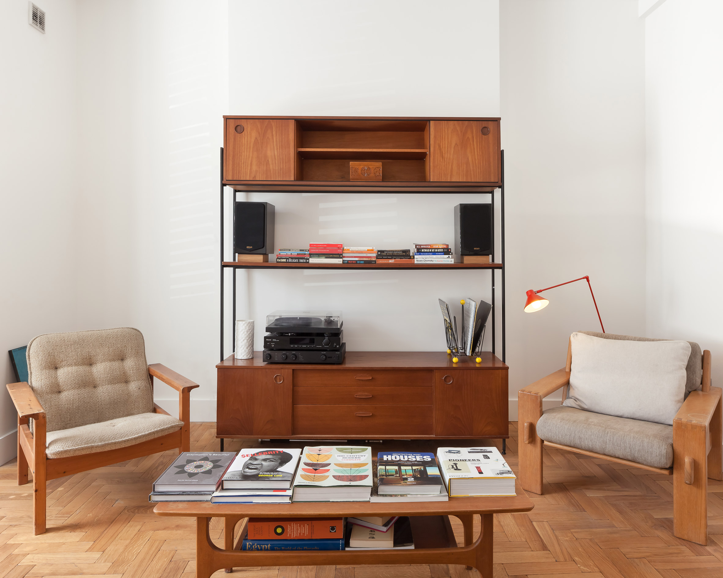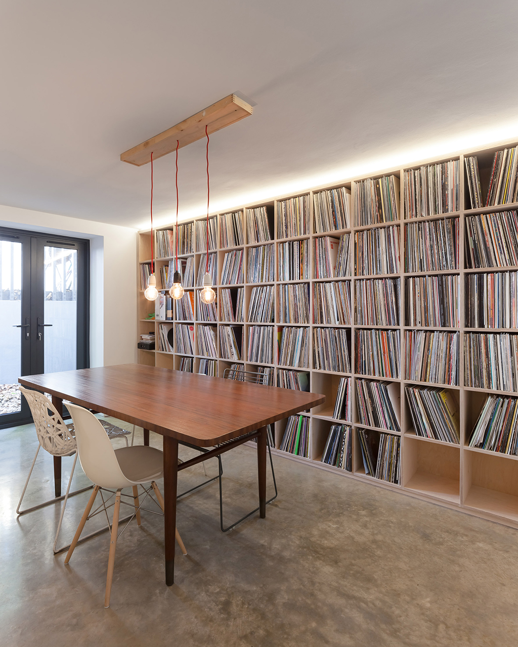 Завършена със собствени мебели на клиента, стената от интегрирани стелажи също е създадена, за да покаже обширна колекция от винилови записи.